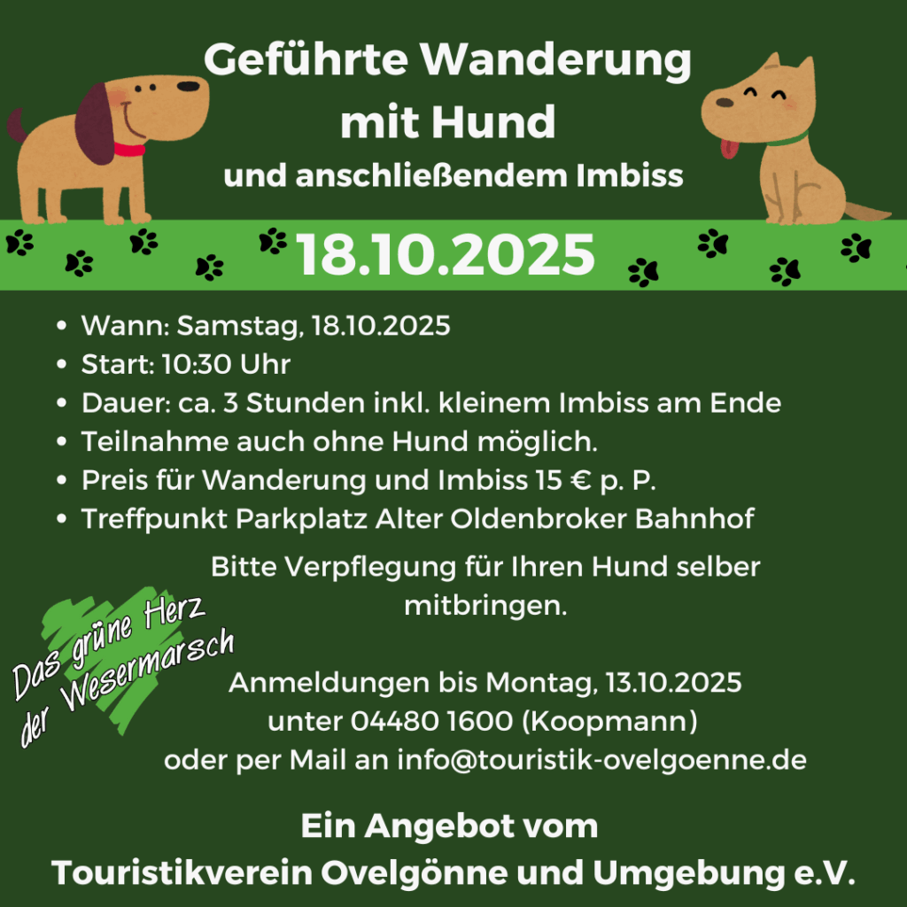 Am Ende bieten wir für die Zweibeiner einen kleinen Imbiss an, für Verpflegung der Vierbeiner sind Frauchen und Herrchen verantwortlich. Die Kosten betragen pro Person 15 Euro. Anmeldungen werden bis zum Montag, 13.10.2025 angenommen. Und zwar unter info@touristik-ovelgoenne.de oder unter Telefon 04480/1600. Wir freuen uns auf Euch!